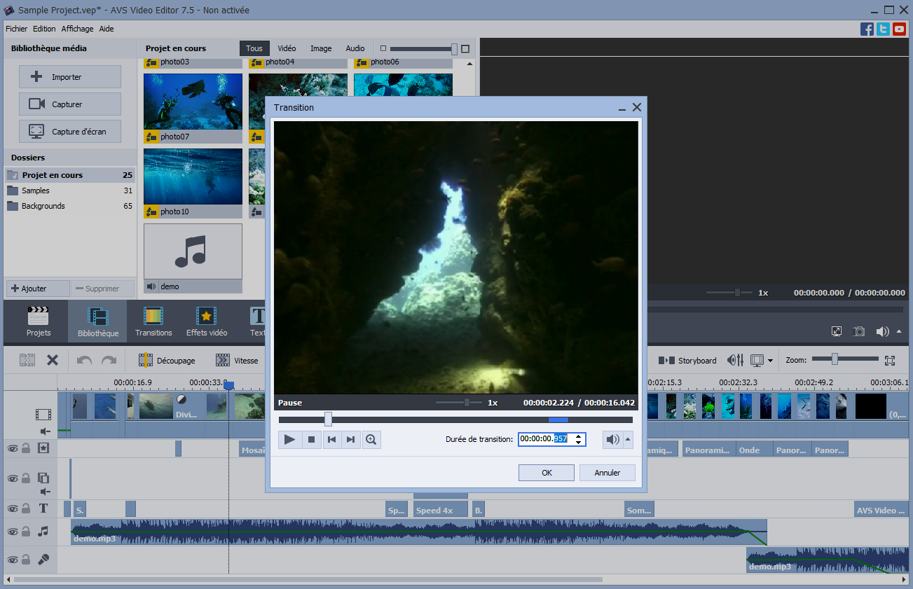 Côté édition, le logiciel dispose d'une ligne du temps plutôt classique au sein de laquelle l'utilisateur peut ajouter des pistes audio ou vidéo, des images et des effets. Sur ce dernier point le logiciel est bien fourni grâce aux nombreuses transitions disponibles.