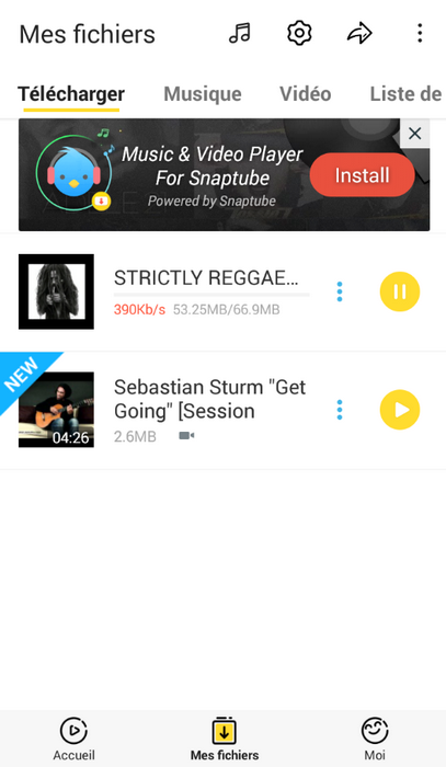 A l'instar de VidMate, Snaptube est une application gratuite permettant de télécharger de la musique et des vidéos en ligne directement sur un téléphone ou une tablette Android. Il est ainsi possible de télécharger et lire le dernier clip de son artiste préféré après l'avoir recherché au sein de l'application puis l'avoir rendu disponible hors ligne. Néanmoins, petit point faible : l'application n'est pas disponible sur le Play Store.